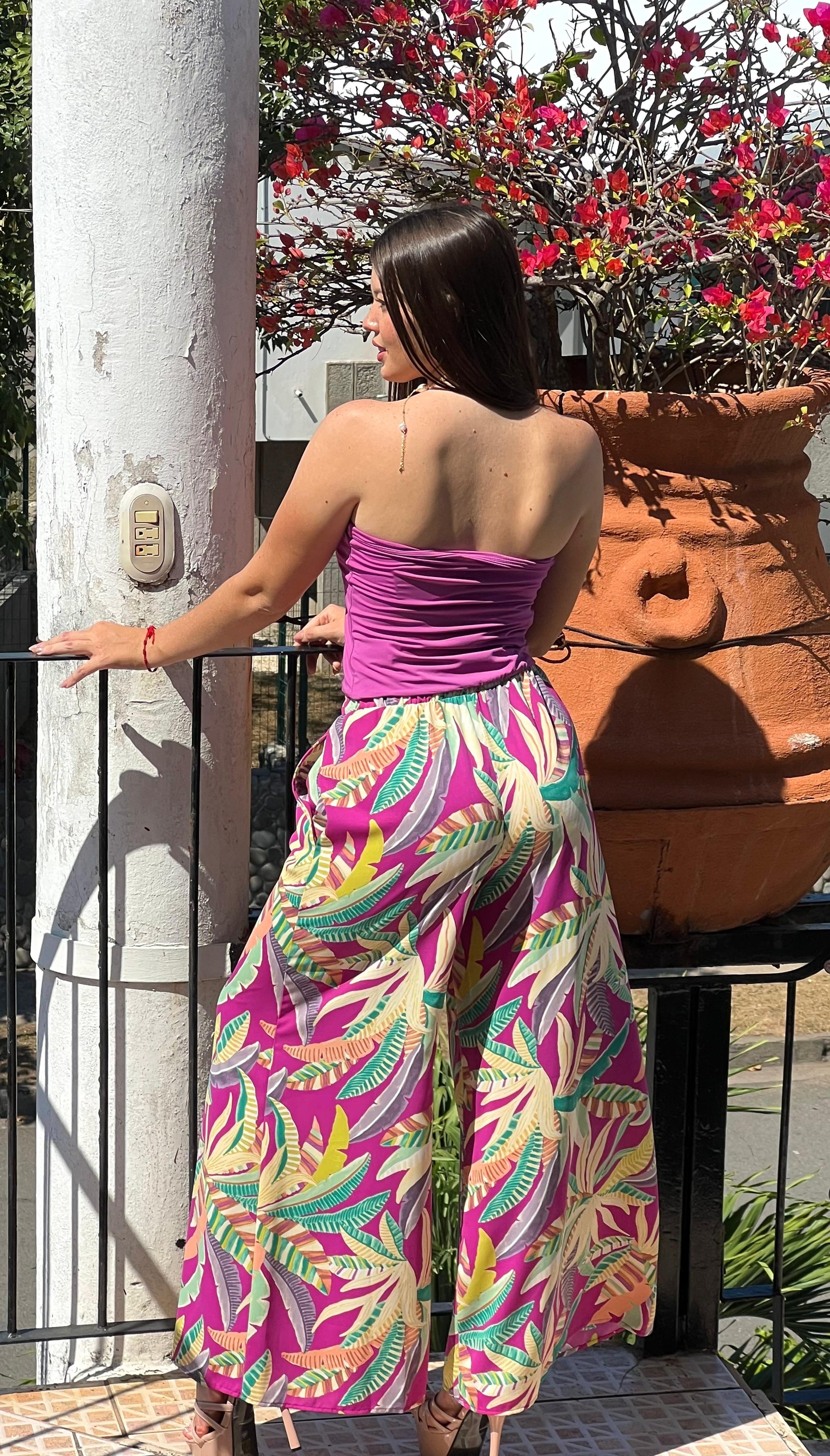 ¡Atrévete a lucir un estilo tropical y audaz con el Pantalón Rene púrpura! Sus amplias piernas y estampado de hojas te harán destacar en cualquier lugar. Da un paso fuera de tu zona de confort y añade este palazo a tu guardarropa ya.