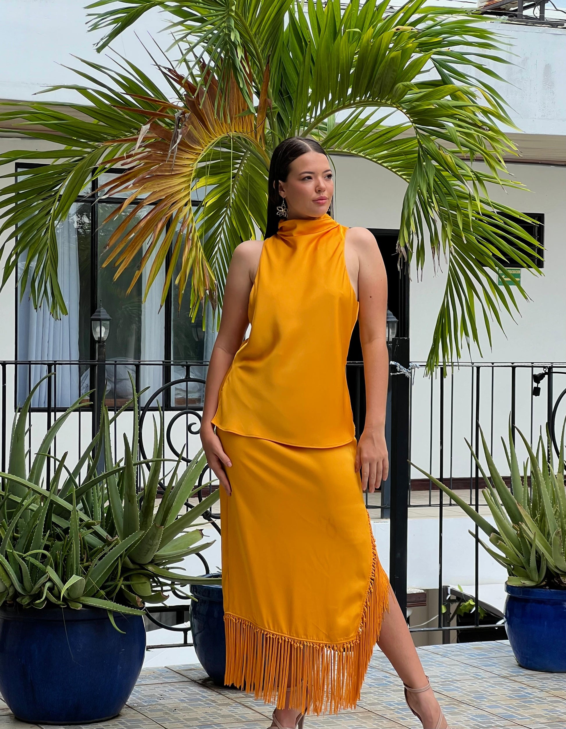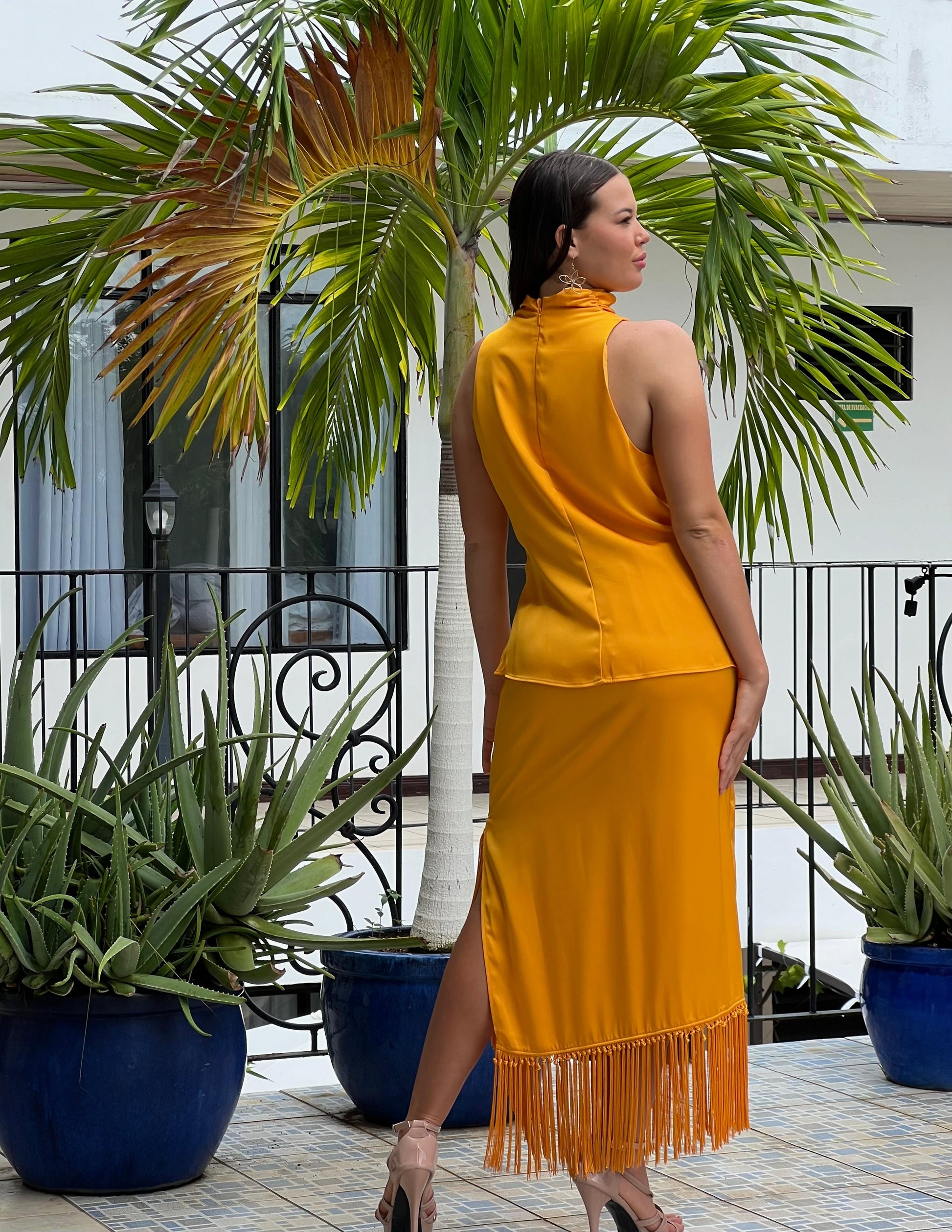 Set Rachel Zoé es el conjunto perfecto para lucir elegante y a la moda. Incluye una blusa con cuello de tortuga que realzará tu figura y una enagua larga amarilla para un toque femenino. ¡Destaca con este set único!