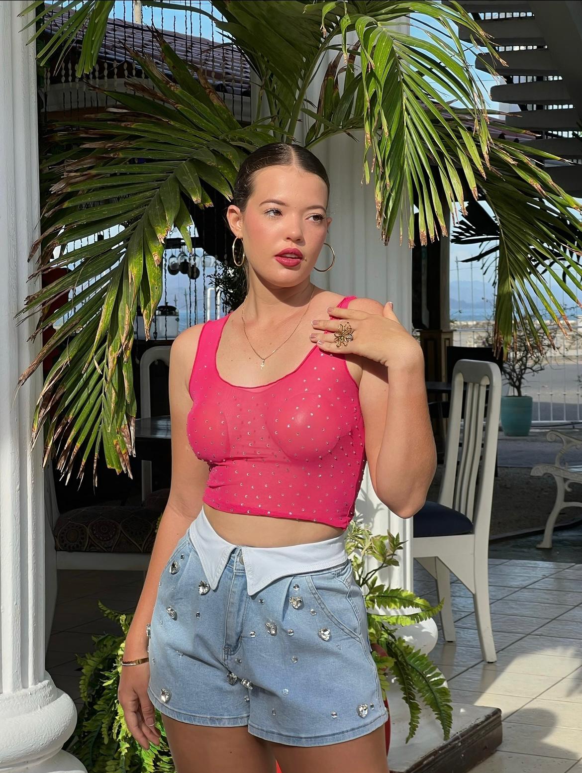 ¡Lleva tus prendas al siguiente nivel con nuestro top Bear! Confeccionado con un diseño atrevido de malla rosa transparente y adornado con diamantes brillantes, este top corto te hará destacar en cualquier ocasión. ¡Únete a la aventura y desafía los límites de la moda con nuestro Top Bear!